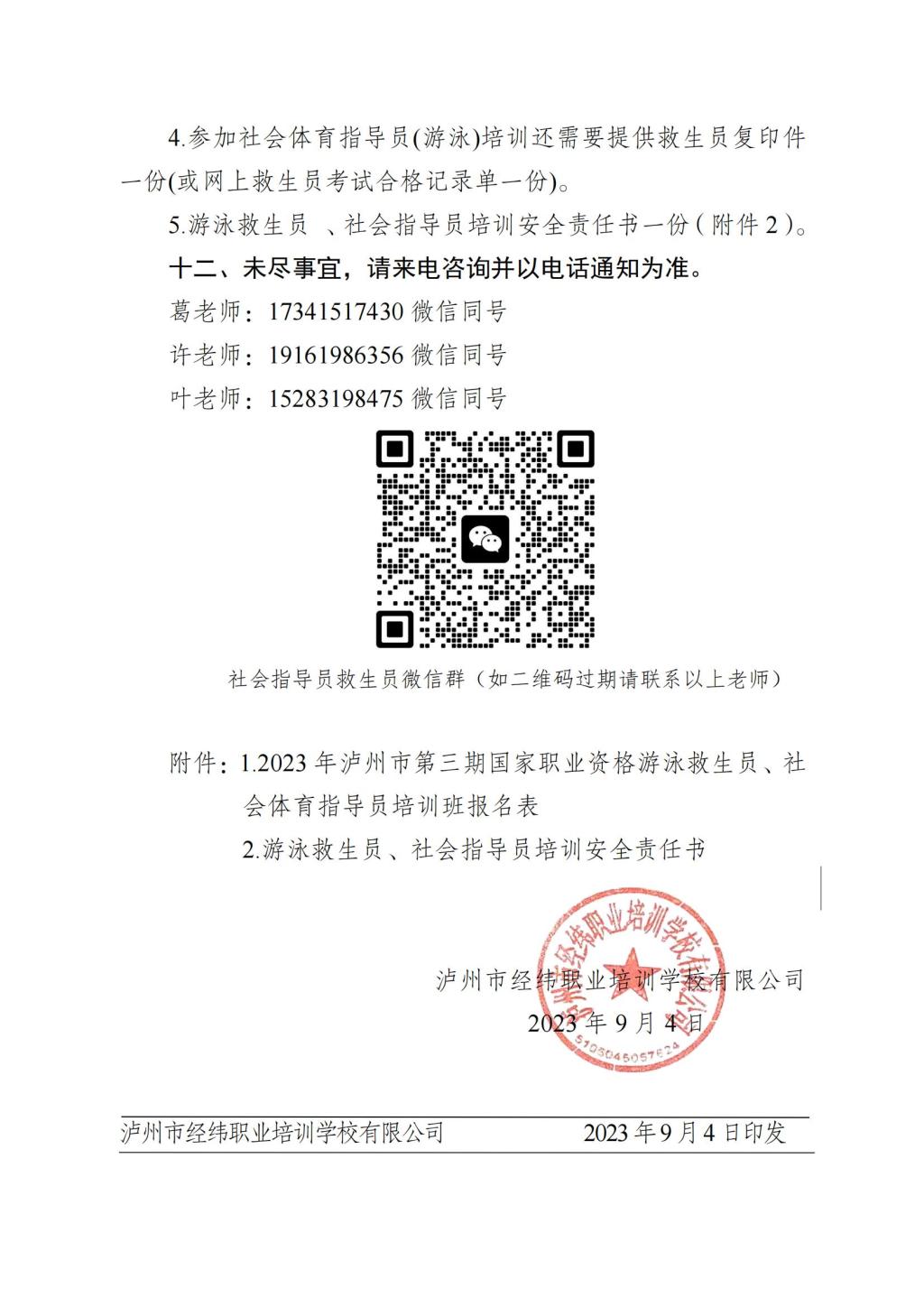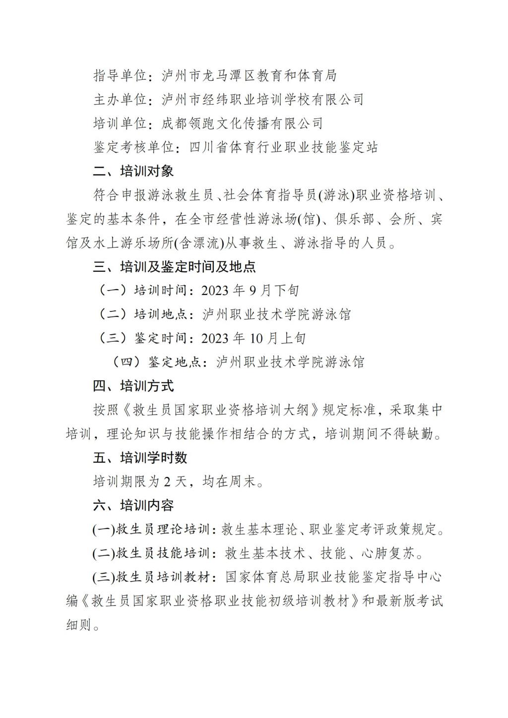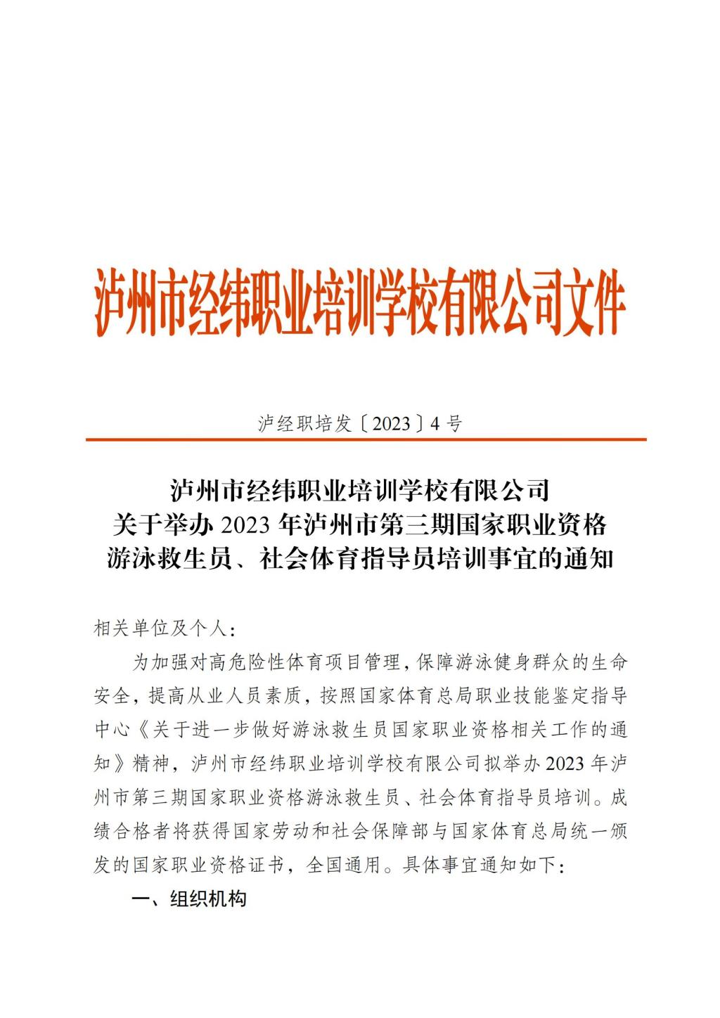 瀘州市經(jīng)緯職業(yè)培訓(xùn)學(xué)校有限公司關(guān)于舉辦2023年瀘州市第三期國(guó)家職業(yè)資格游泳救生員、社會(huì)體育指導(dǎo)員培訓(xùn)事宜的通知