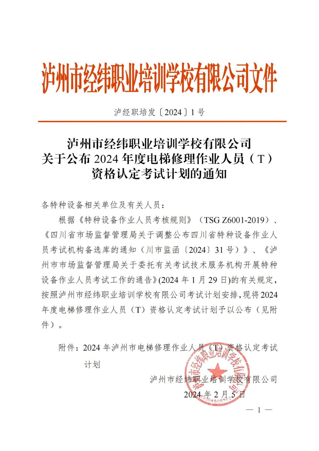 瀘州市經(jīng)緯職業(yè)培訓(xùn)學(xué)校有限公司關(guān)于公布2024年度電梯修理作業(yè)人員(T)資格認(rèn)定考試計(jì)劃的通知
