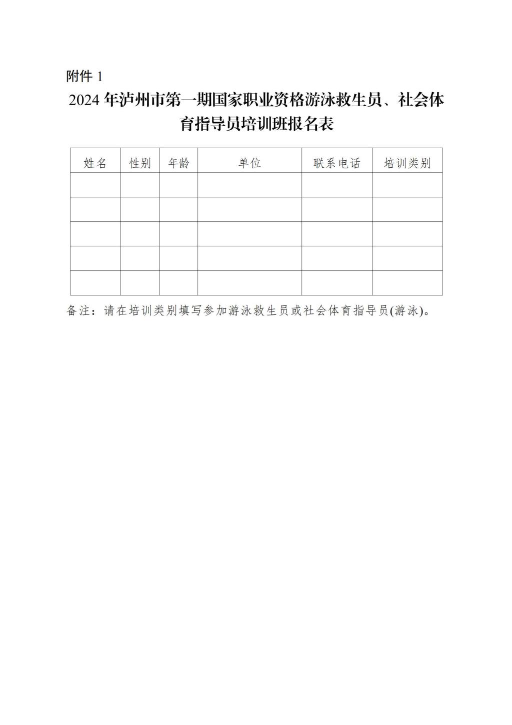 附件1-2024年瀘州市第一期國家職業(yè)資格游泳救生員、社會體育指導(dǎo)員培訓(xùn)班報名表
