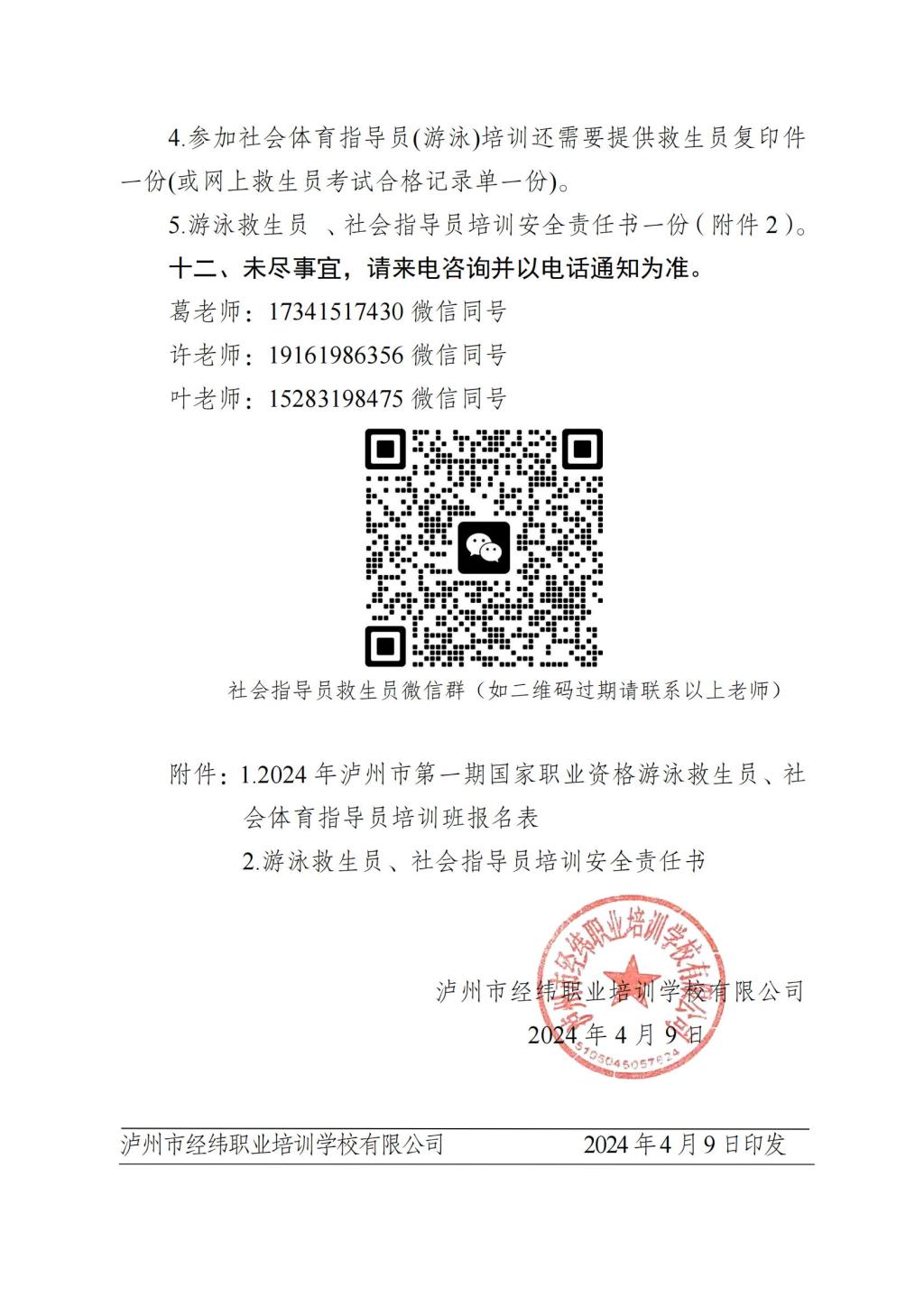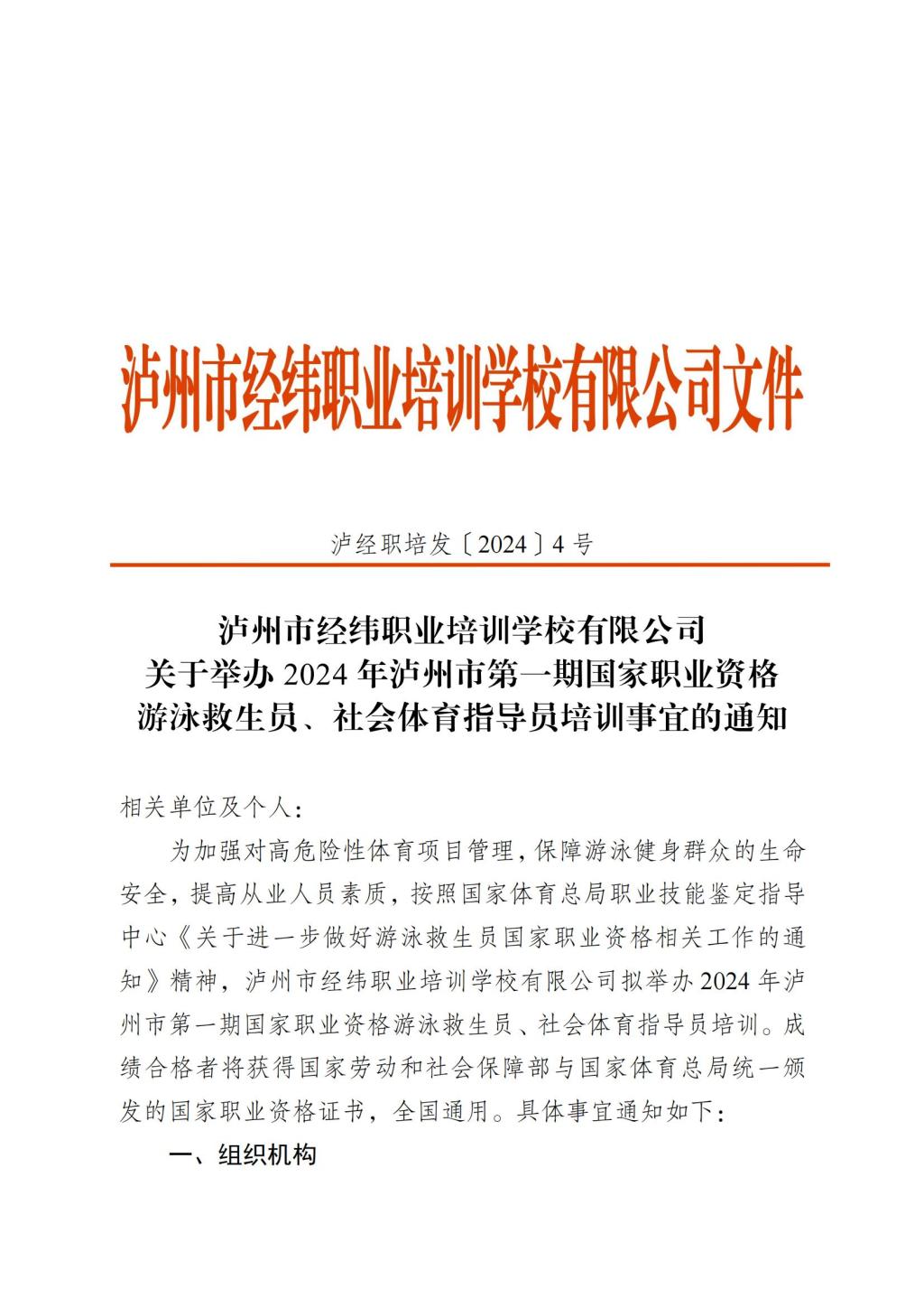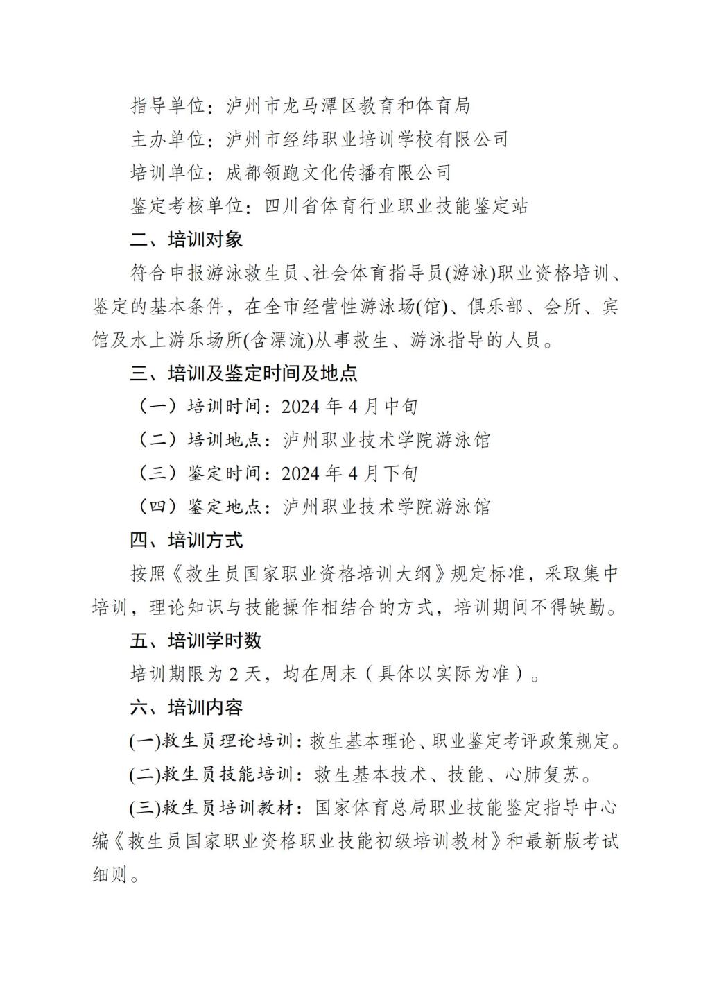 瀘州市經(jīng)緯職業(yè)培訓(xùn)學(xué)校有限公司關(guān)于舉辦2024年瀘州市第一期國家職業(yè)資格游泳救生員、社會體育指導(dǎo)員培訓(xùn)事宜的通知